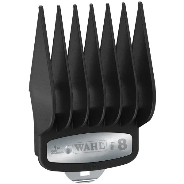 From Wahl Professional’s line of products, our Premium Black Cutting Guides were designed for professional use with Wahl Professional full-sized clippers (excluding detachable blade clippers). These secure-fitting durable metal clips come in a range of sizes for precision fades and dependable lengths, including 1/8”, ¼”, 3/8”, ½”, 5/8”, ¾”, 7/8”, and 1”. With the exception of Wahl’s competition series blades (and detachable blades), our Premium Cutting Guides will fit all full-size clipper blades for maximum versatility. Package includes (8) Premium Black Cutting Guides (#3171-500) – 1/8”, ¼”, 3/8”, ½”, 5/8”, ¾”, 7/8”, and 1” and comb tray. Secure, smooth, and precise, the Premium Cutting Guides are a must have for every busy barber or stylist.